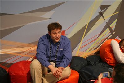 Ο Μάνος Κελαϊδίτης (KelMain) ενώ πέρνει συνέντευξη από τον Clemens Vasters. Ελπίζω να μην είναι οι ερωτήσεις του Μάνου που ο Clemens Vasters κάνει τέτοιες γκριμάτσες.